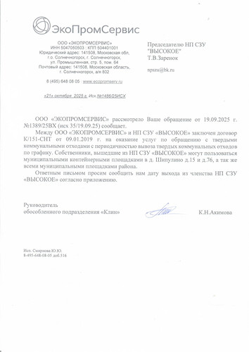 | Уважаемые собственники по вопросу оплаты членами НП и "деревенскими" вывоза мусора представляю разъяснение ЭкоПромСервиса. Члены НП и собственники, заключившие договор пользования инфраструктурой выбрасывают бытовой мусор (не строительный) на мусорную площадку на территории НП СЗУ Высокое. Остальные на мусорные площадки в "вашей" д. Шипулино. Просьба не создавать двойные стандарты: если не платим, то мусор везем в свою деревню. Кстати, за вывоз мусора надо платить, это решение государства, где мы все живем, но часть деревенских счета ЭкоПромСервиса игнорирует и не оплачивает, это не правильно. Нельзя всю жизнь сидеть на чужой шее.